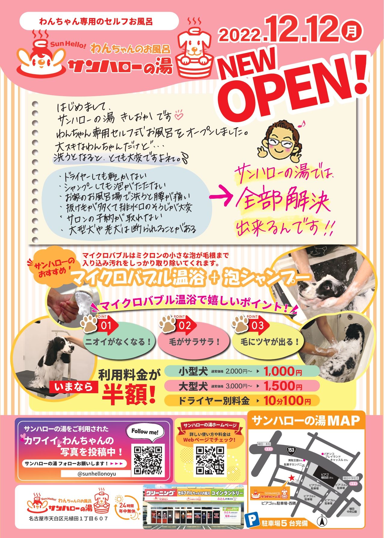 12月12日わんちゃん専用お風呂サンハローの湯 オープンしました。 サンハローの湯オススメ マイクロバブル温浴+泡シャンプーコースが半額になります。 無料体験ご参加の方もはじめてサンハローの湯に 来るお客様も、たくさんご利用ください。 よろしくお願いします。 ご利用の際は、予約サイトから予約をお願いします。