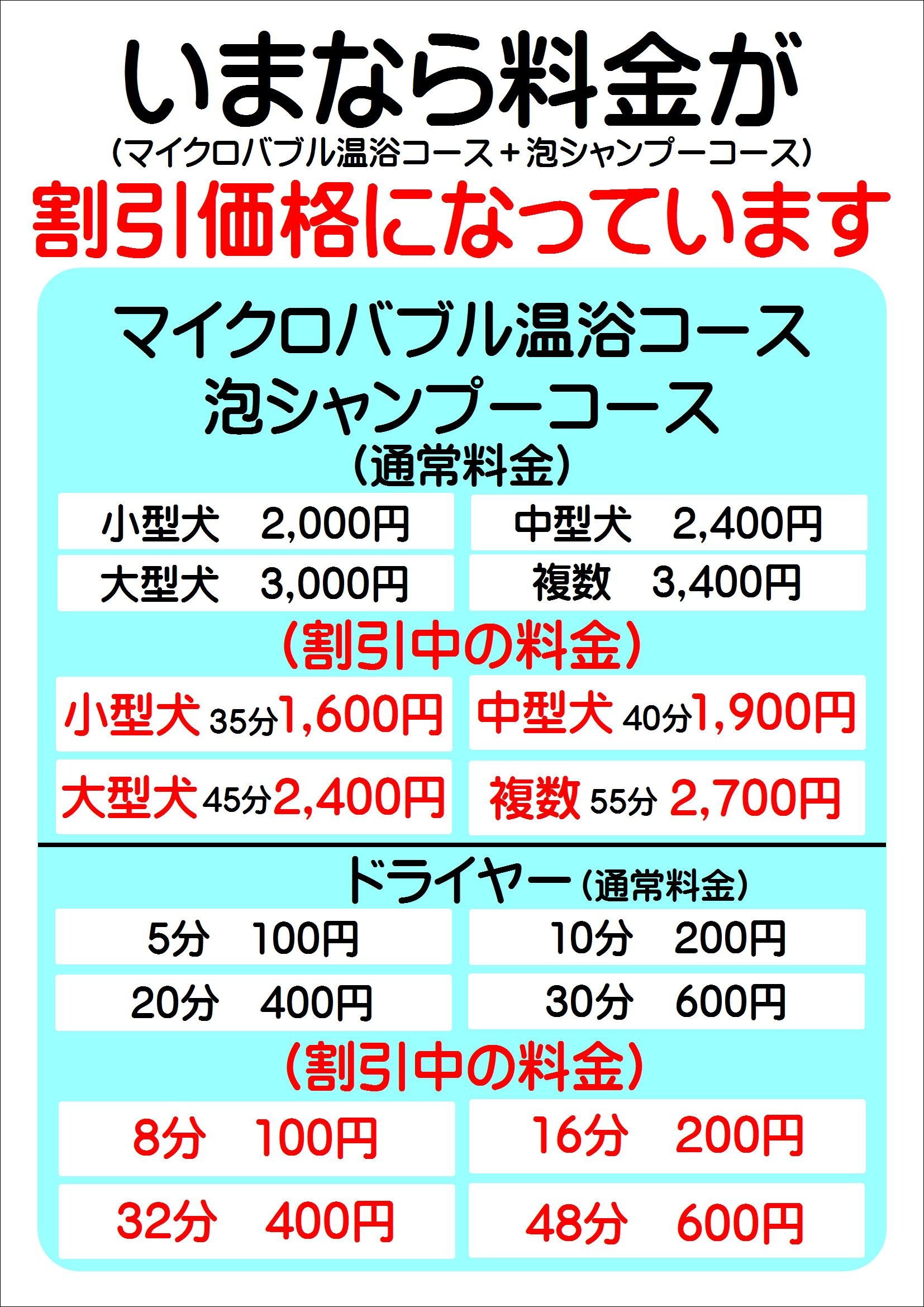 マイクロバブル温浴+泡シャンプーコースが割引になります。 ドライヤー5分100円が8分100円です。 小型犬 中型犬 大型犬 老犬(短い時間で) 皮膚の弱いわんちゃん(マイクロバブル浴槽) などご利用をお待ちしております。